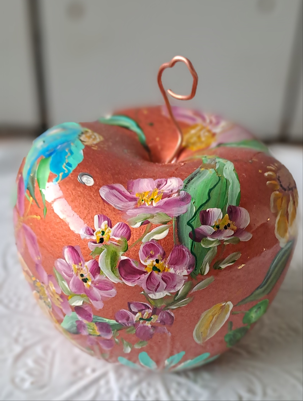 Decoratieve appel . Koperkleur ondergrond met kleurrijke bloemen beschilderd!
