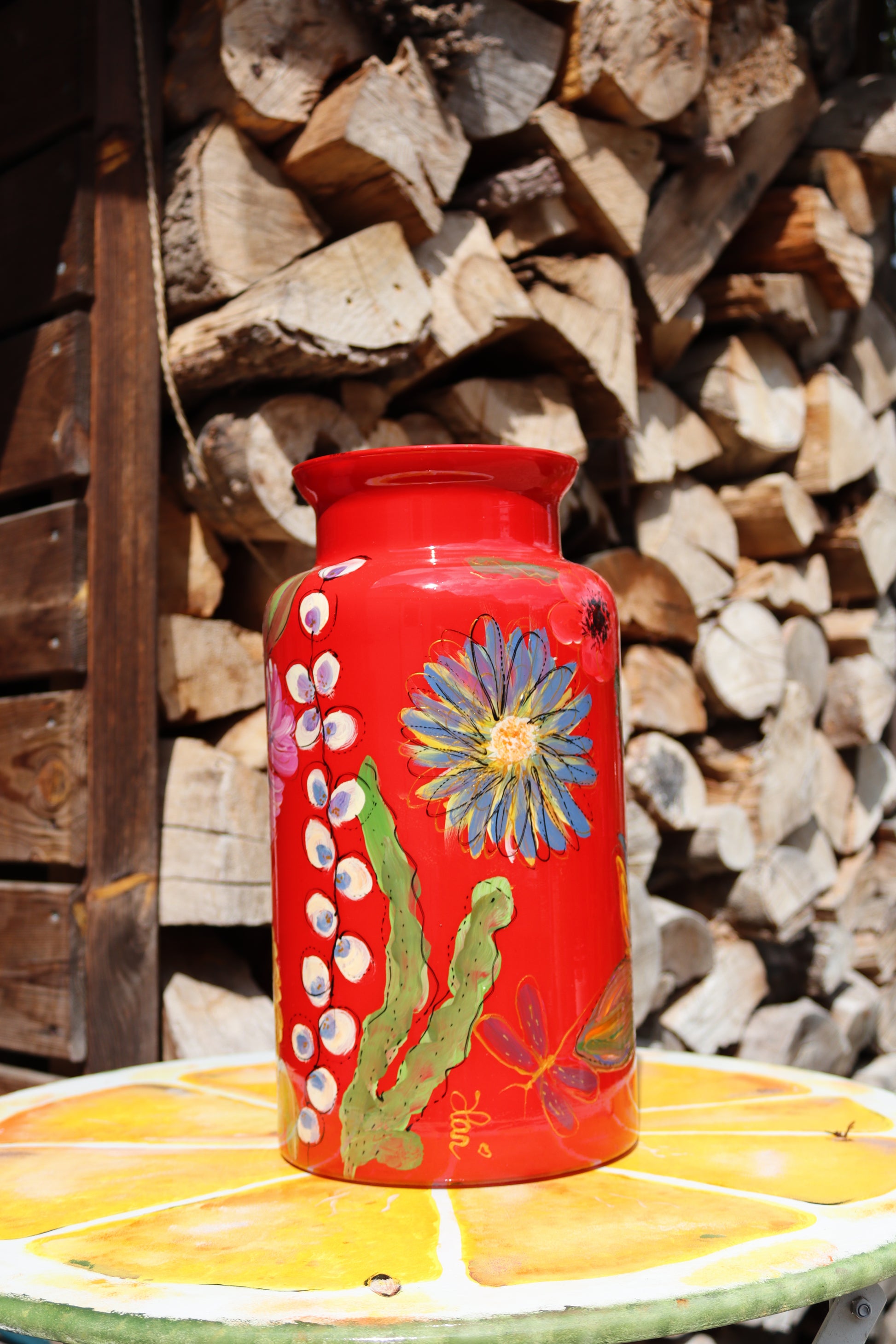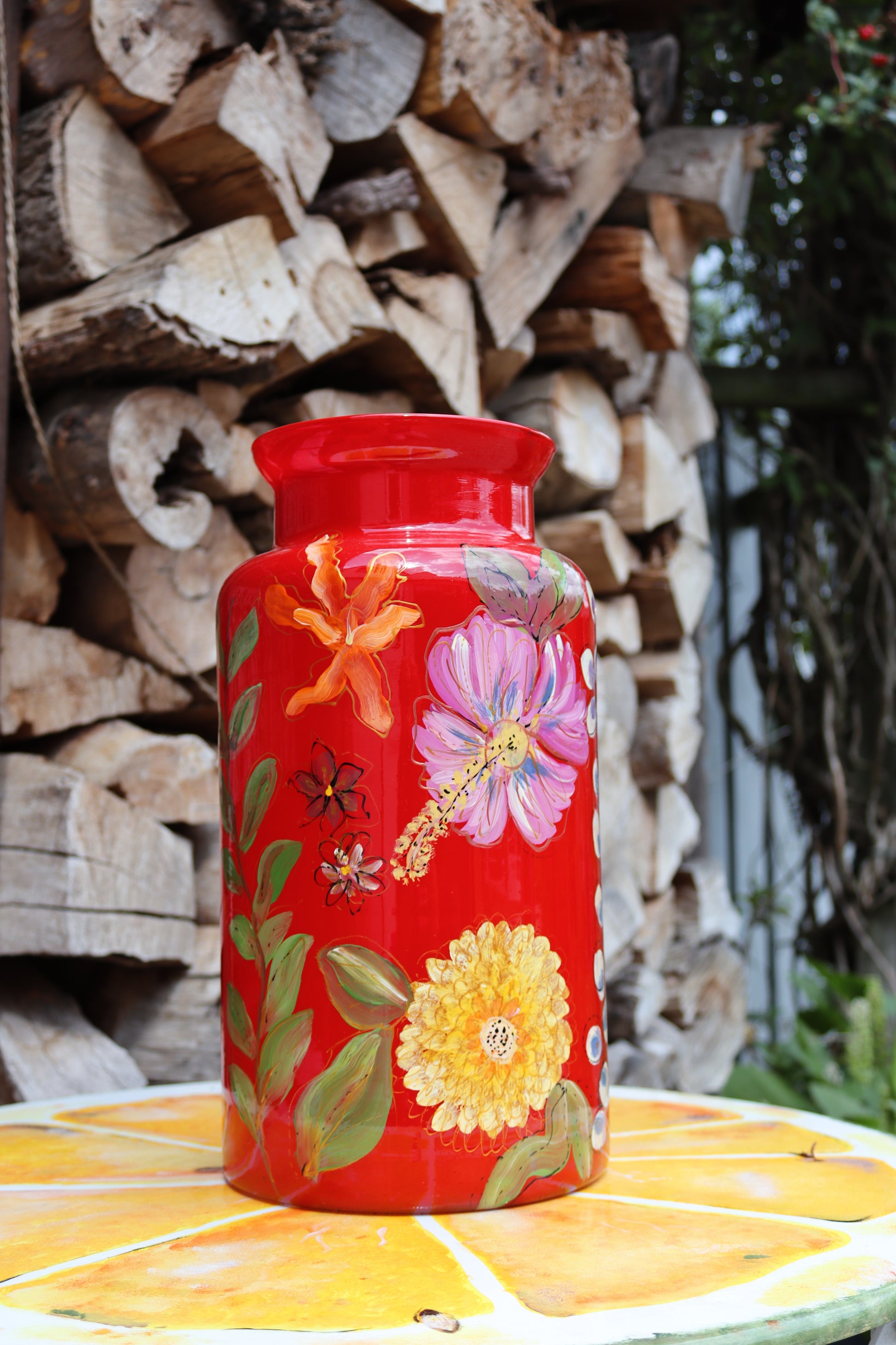 Deze handgemaakte vaas is een echt kunstwerk dat de schoonheid van de natuur in huis brengt. Met haar levendige rode kleur als achtergrond en het delicate bloemenmotief, straalt de vaas niet alleen kleur en leven uit, maar vertelt ook een verhaal van creativiteit en vakmanschap. De bloemen zijn met zorg geschilderd, elk in een unieke tint, van zachte paarse tinten tot levendige oranje bloemen. Het samenspel van de kleuren maakt de vaas een betoverend stuk dat je kamer tot leven brengt.