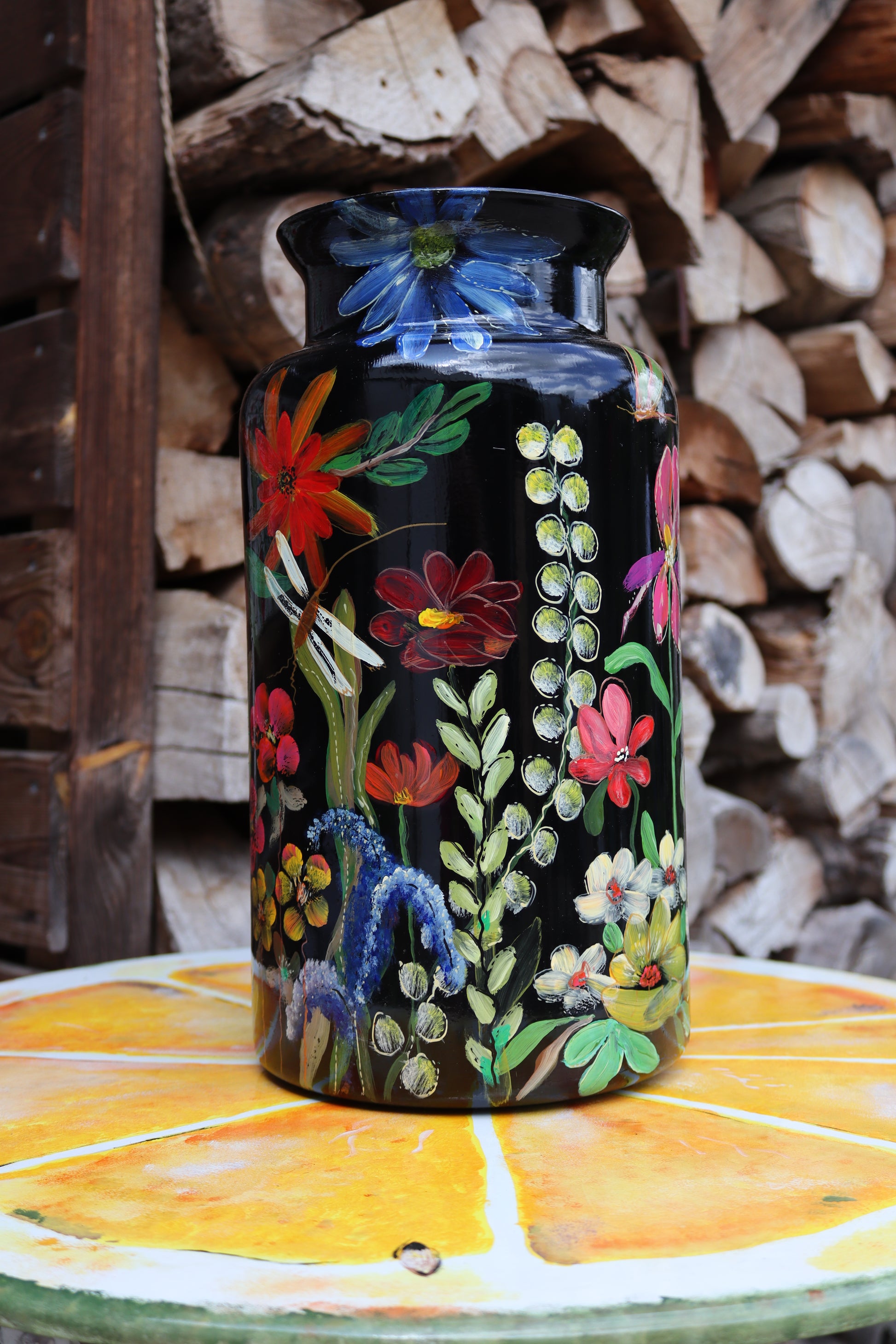 De zwarte achtergrond maakt de kleuren van de bloemen nog intenser, waardoor de vaas bijna lijkt te stralen. De levendige kleuren doen denken aan een zomerse bloementuin in volle bloei, waarbij elk bloemblad met zorg is aangebracht om de pracht van de natuur te vangen. De libel die langs de bloemen fladdert, voegt een vleugje speelsheid en dynamiek toe, wat de vaas een extra dimensie geeft.