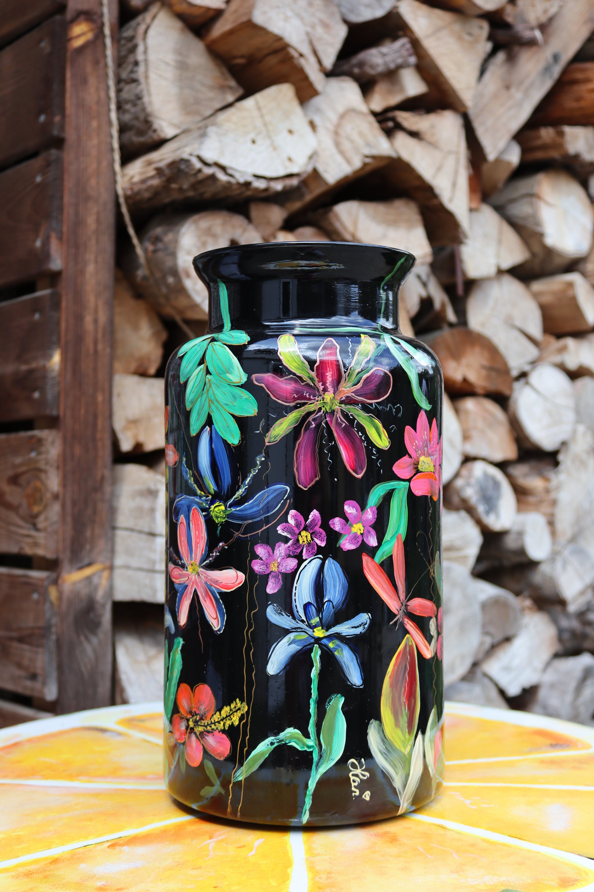 Deze vaas is een prachtig kunstwerk dat de natuurlijke schoonheid van bloemen en de mysterieuze charme van een zwarte achtergrond combineert. Het diepe zwart van de vaas vormt het perfecte canvas voor het kleurrijke bloemenmotief dat zich erover uitstrekt, met bloemen in levendige tinten van rood, geel, roze en blauw. Het ontwerp is rijk aan detail, met handgeschilderde bloemblaadjes, bladeren en zelfs een delicate libel die een speelse beweging aan het geheel toevoegt.