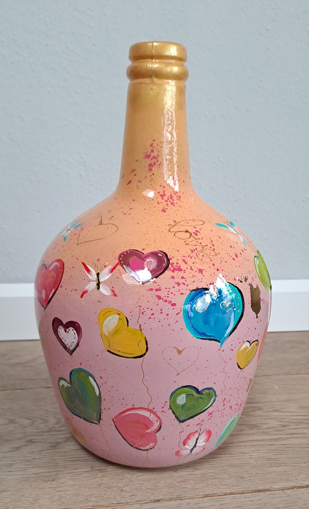 Flesvaas beschilderd met lieve gekleurde hartjes! Beschilderd op een roze met zacht oranje ondergrond. Hoogte 31 cm, breedte is 21 cm.