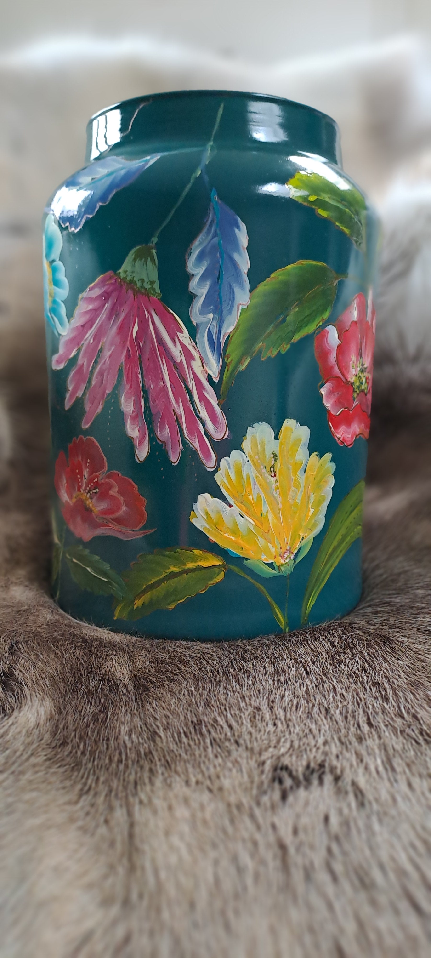 De kleurrijke bloemen komen prachtig uit op de petrolkleur ondergrond.